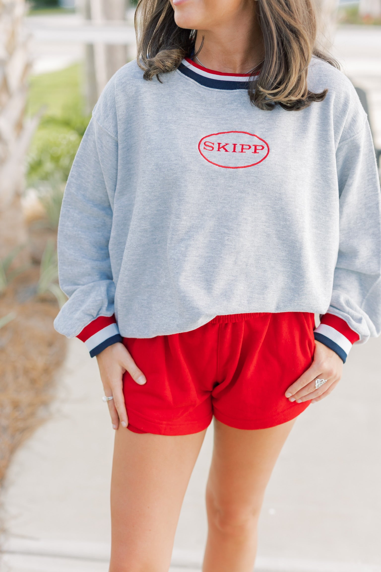 Design: Heather grey mockneck with red SKIPP logo.